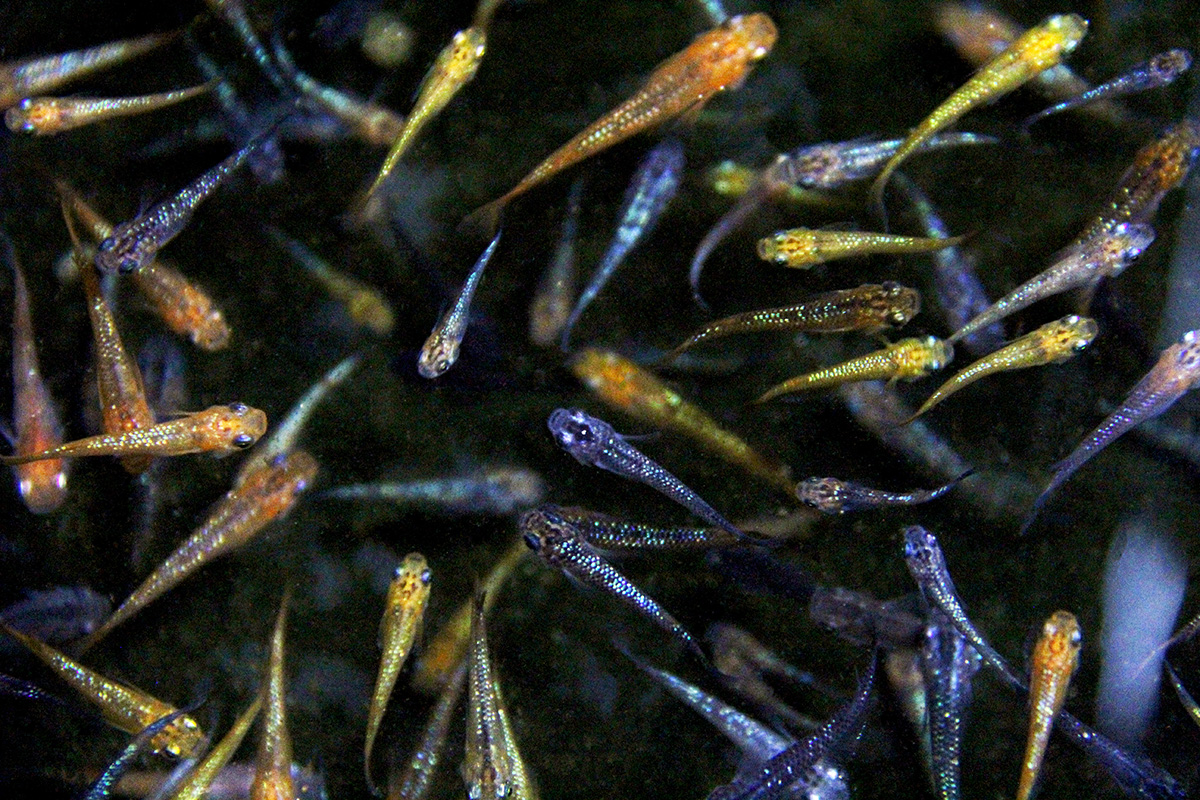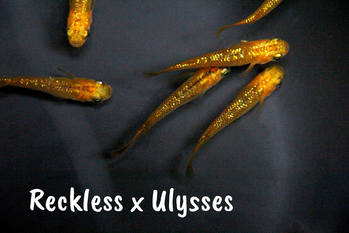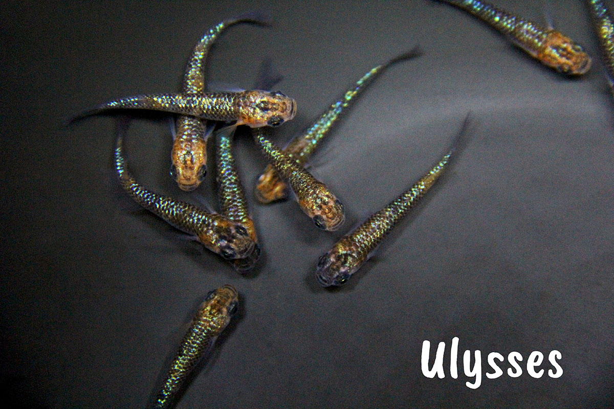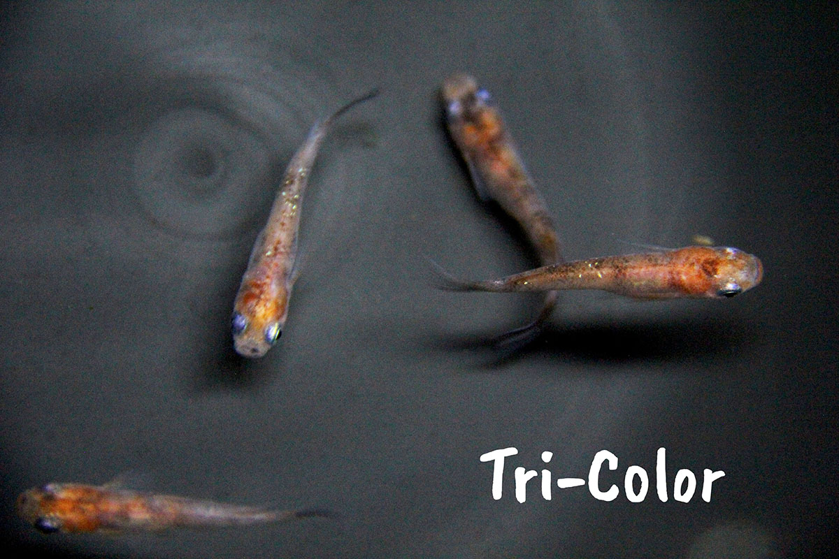 These ricefish can be either Ulysses, Reckless x Ulysses, Tri-Color, Yozakura, Yozakura Gold, or a possible mix between these strains. Young fry may take a while to develop their full colors, which display best when they are kept in a black container or an aquarium with a dark background and bottom. Medaka ricefish originated in East Asia and were commonly found in rice fields, giving them the name "ricefish". They are a very hardy fish that can withstand temperatures as low as 35F and as high as 105F, but prefer to stay between 60F-80F. They do not like aquariums or ponds with a strong current, and are actually often kept in mini ponds with no filter or aeration. Ricefish are like Koi fish, and are bred to be viewed from the top, making them excellent choices for pond fish!
