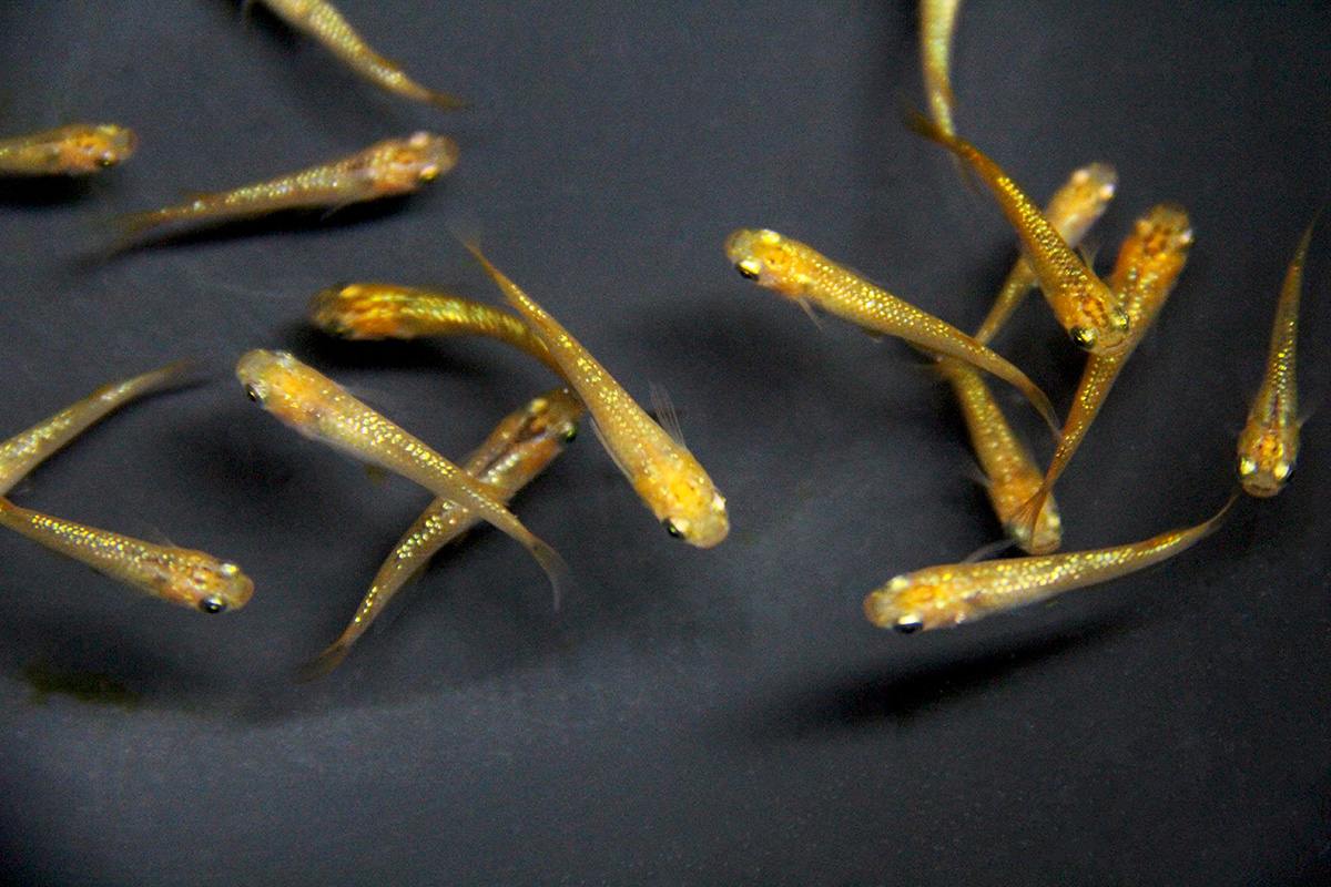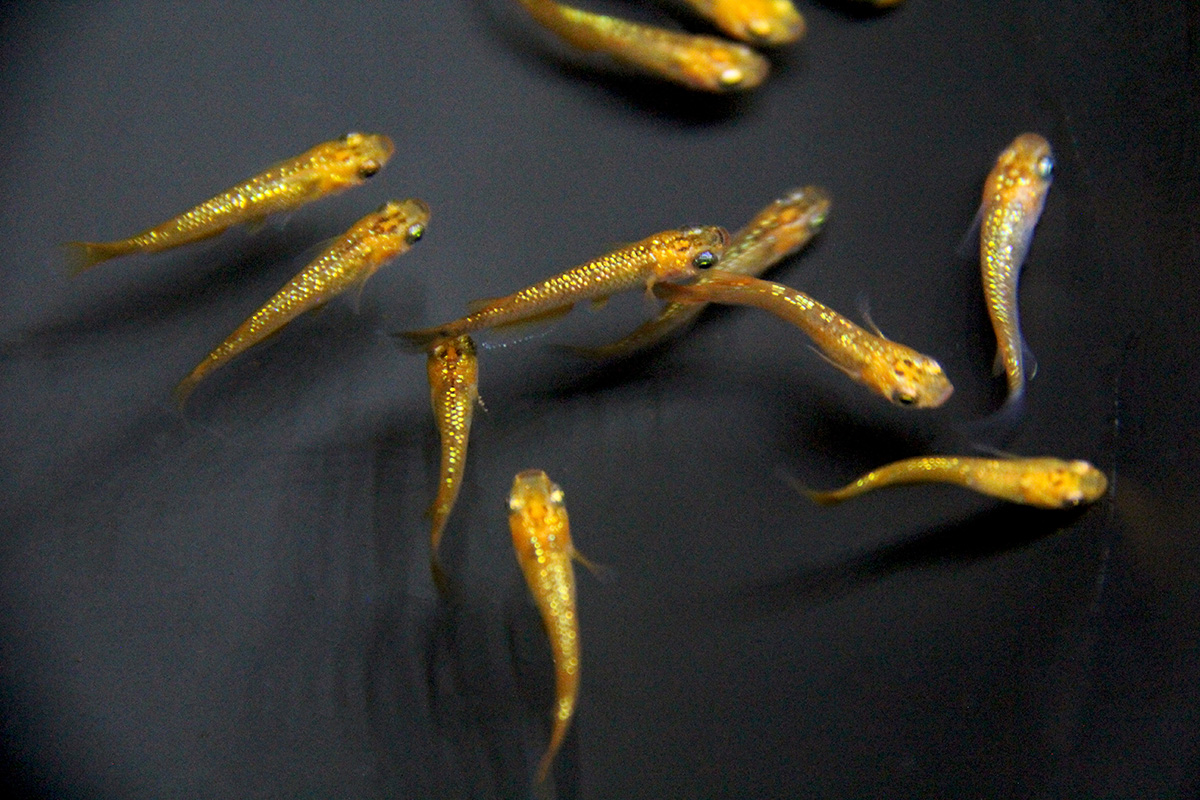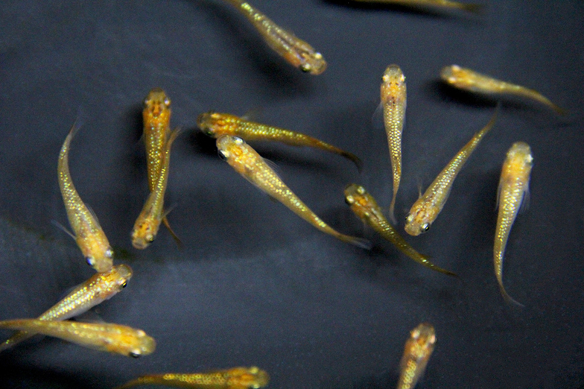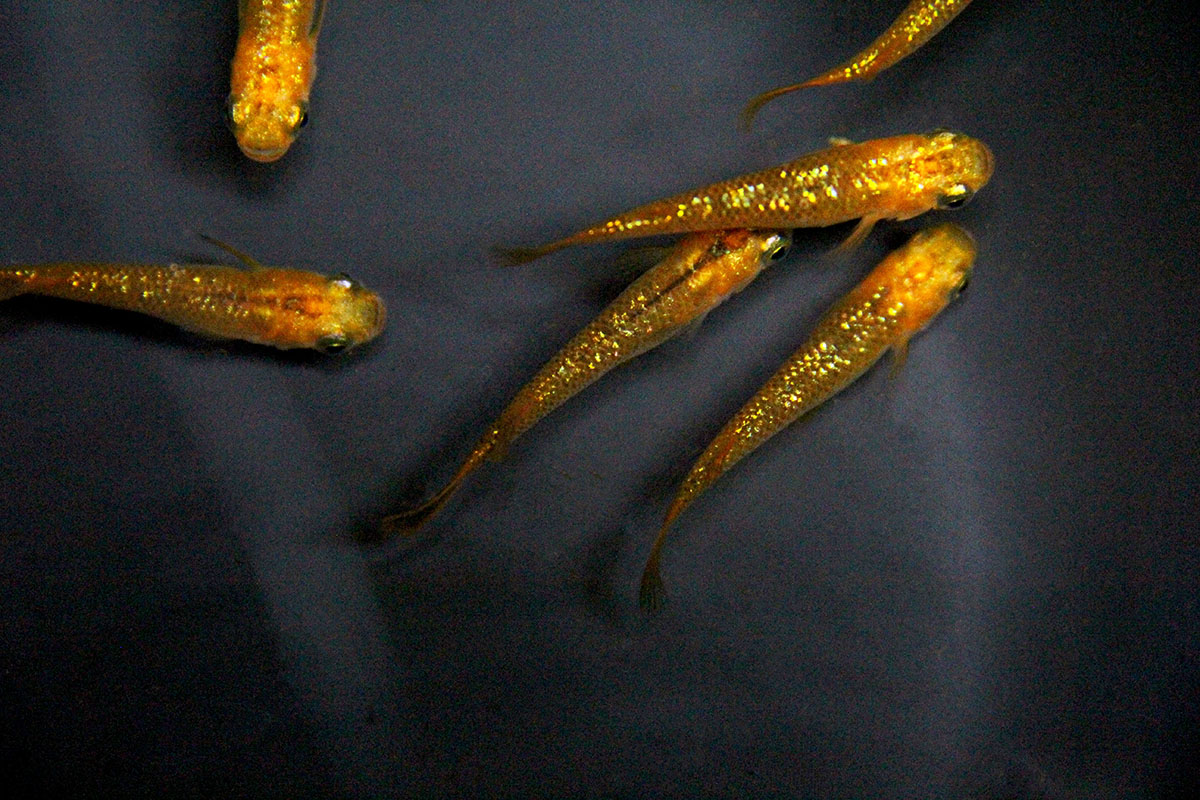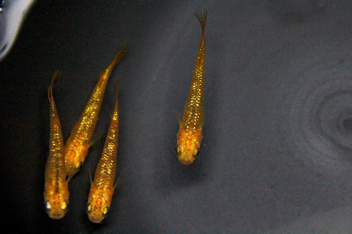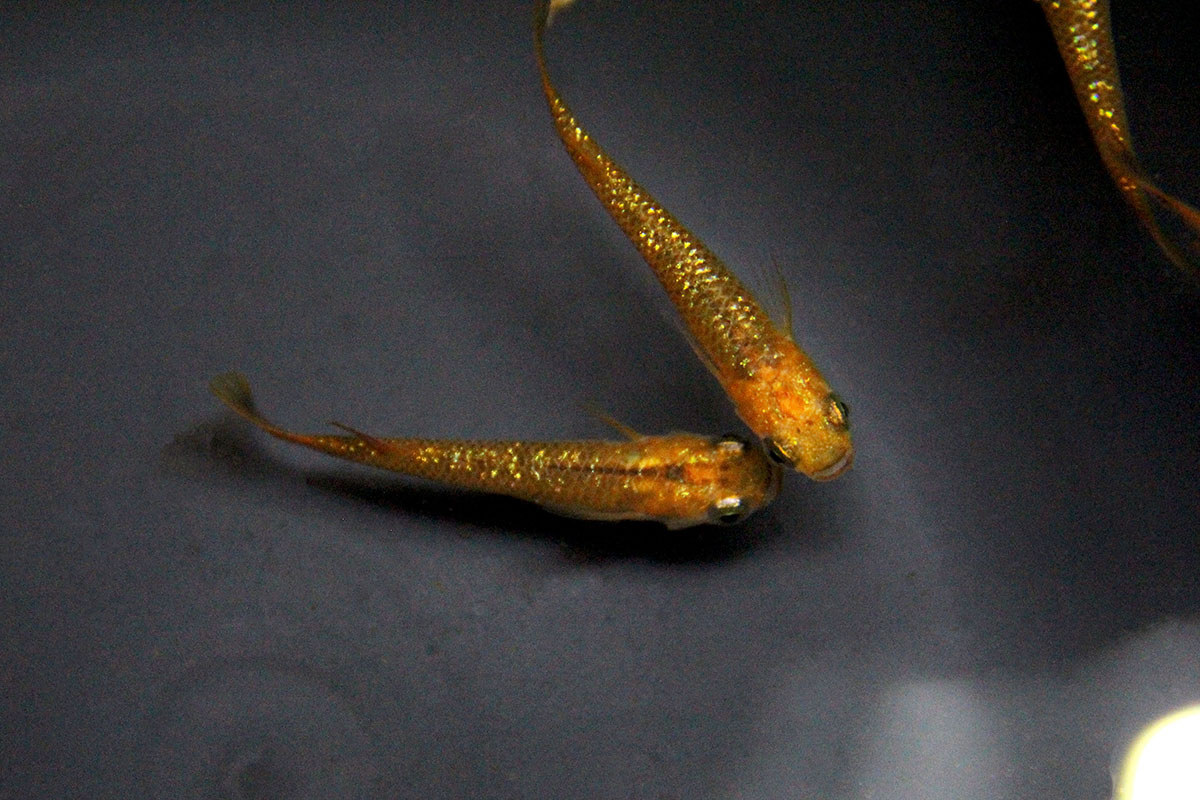 Reckless x Ulysses Medaka are a cross between Reckless ricefish and Ulysses ricefish. They display a gorgeous golden/turqoise lamé on top of a vibrant yellow/orange body. Young fry may take a while to develop their full colors, which display best when they are kept in a black container or an aquarium with a dark background and bottom. Medaka ricefish originated in East Asia and were commonly found in rice fields, giving them the name "ricefish". They are a very hardy fish that can withstand temperatures as low as 35F and as high as 105F, but prefer to stay between 60F-80F. They do not like aquariums or ponds with a strong current, and are actually often kept in mini ponds with no filter or aeration. Ricefish are like Koi fish, and are bred to be viewed from the top, making them excellent choices for pond fish!