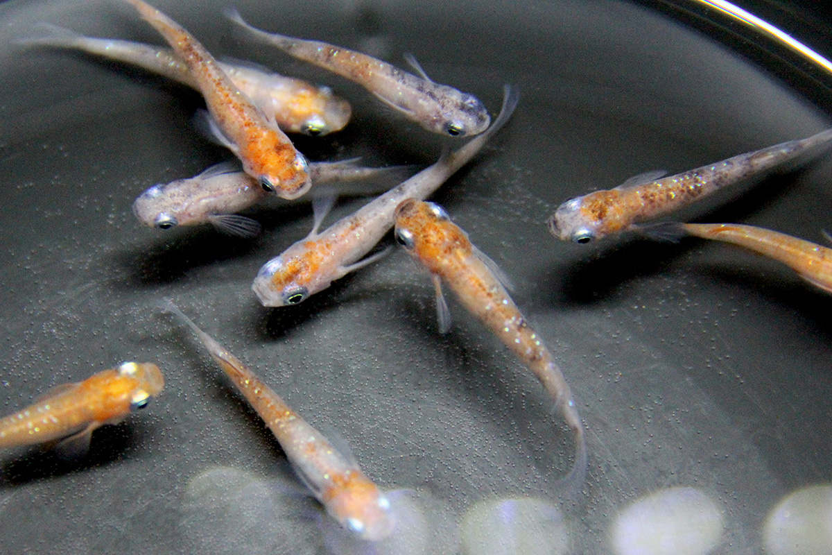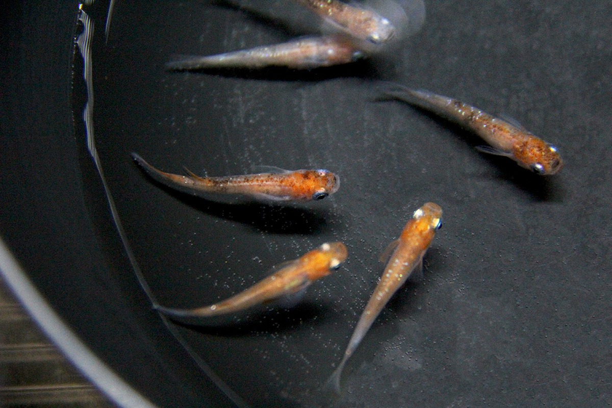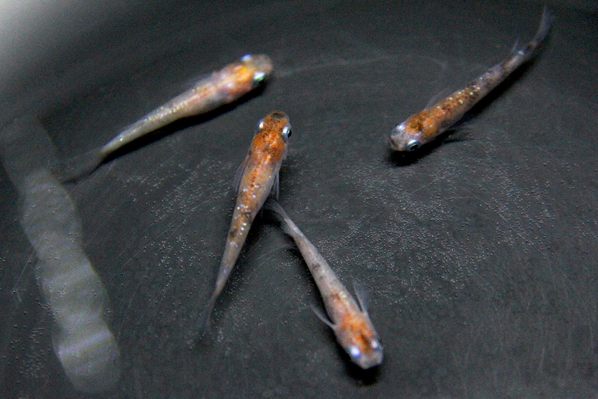 With its distinct tri-color pattern of red/orange, black, and white, these medaka will add a splash of brilliance to any aquarium. For this particular strain of ricefish, it is important they get adequate lighting and are preferably kept in a black container for best coloration. Young fry may take a while to develop their full colors (especially the black markings), which display best when they are kept in a black container or an aquarium with a dark background and bottom. Medaka ricefish originated in East Asia and were commonly found in rice fields, giving them the name "ricefish". They are a very hardy fish that can withstand temperatures as low as 35F and as high as 105F, but prefer to stay between 60F-80F. They do not like aquariums or ponds with a strong current, and are actually often kept in mini ponds with no filter or aeration. Ricefish are like Koi fish, and are bred to be viewed from the top, making them excellent choices for pond fish!