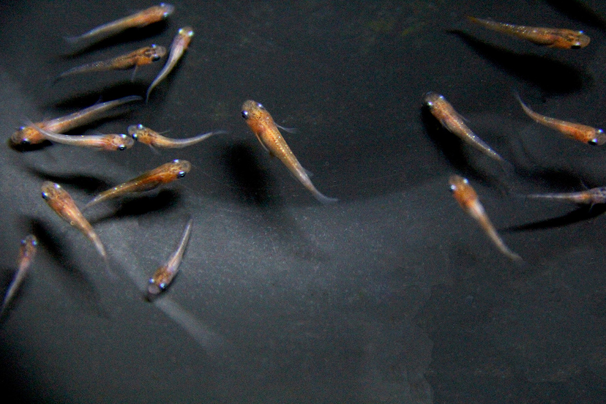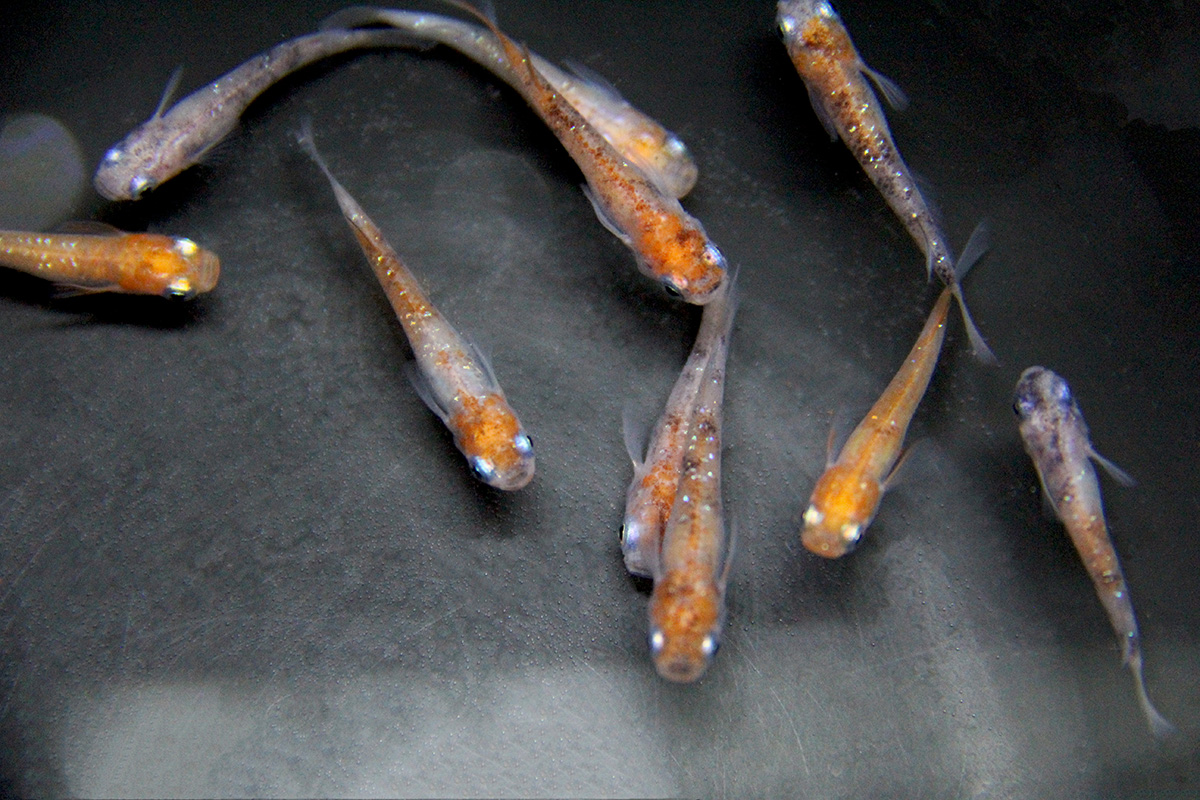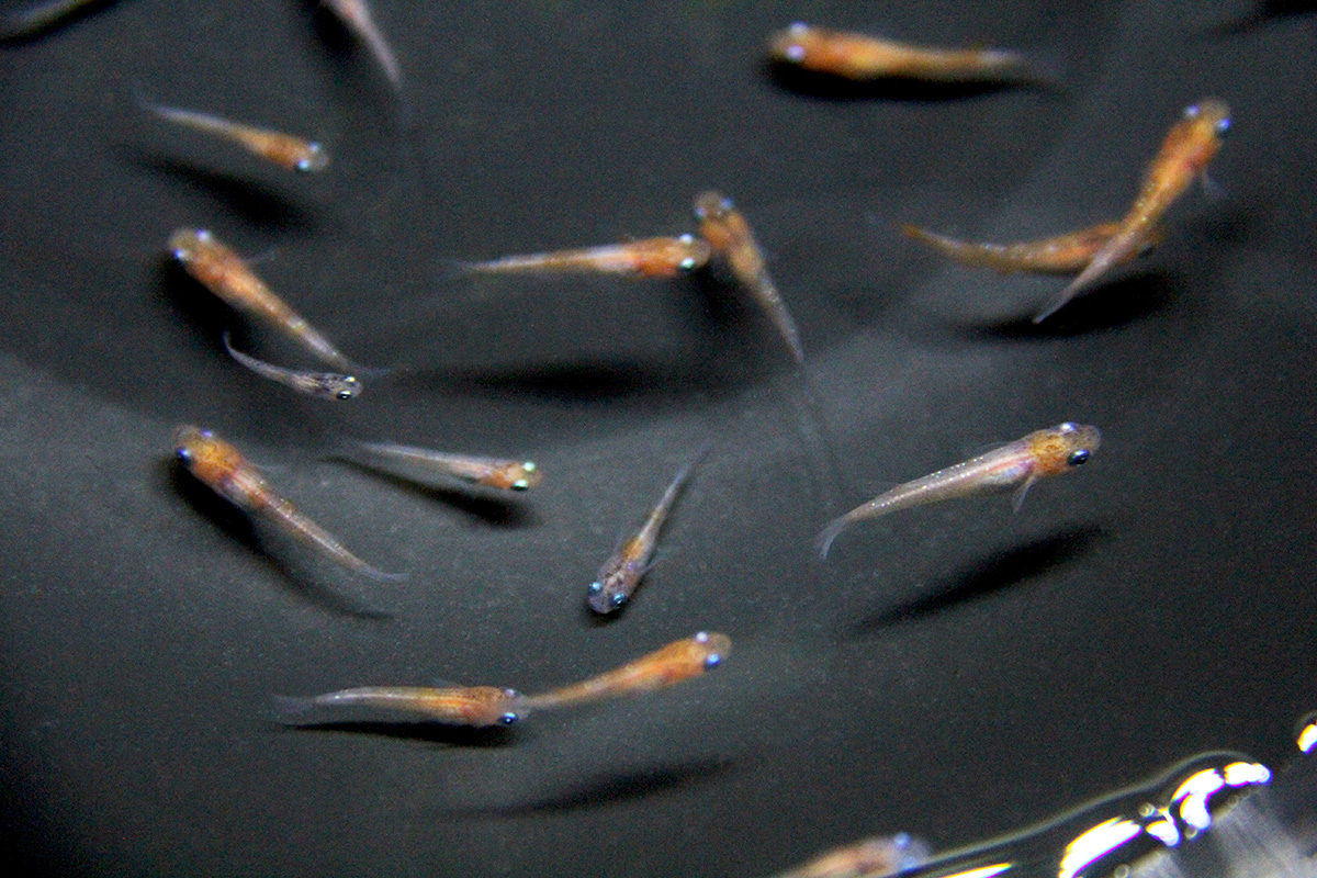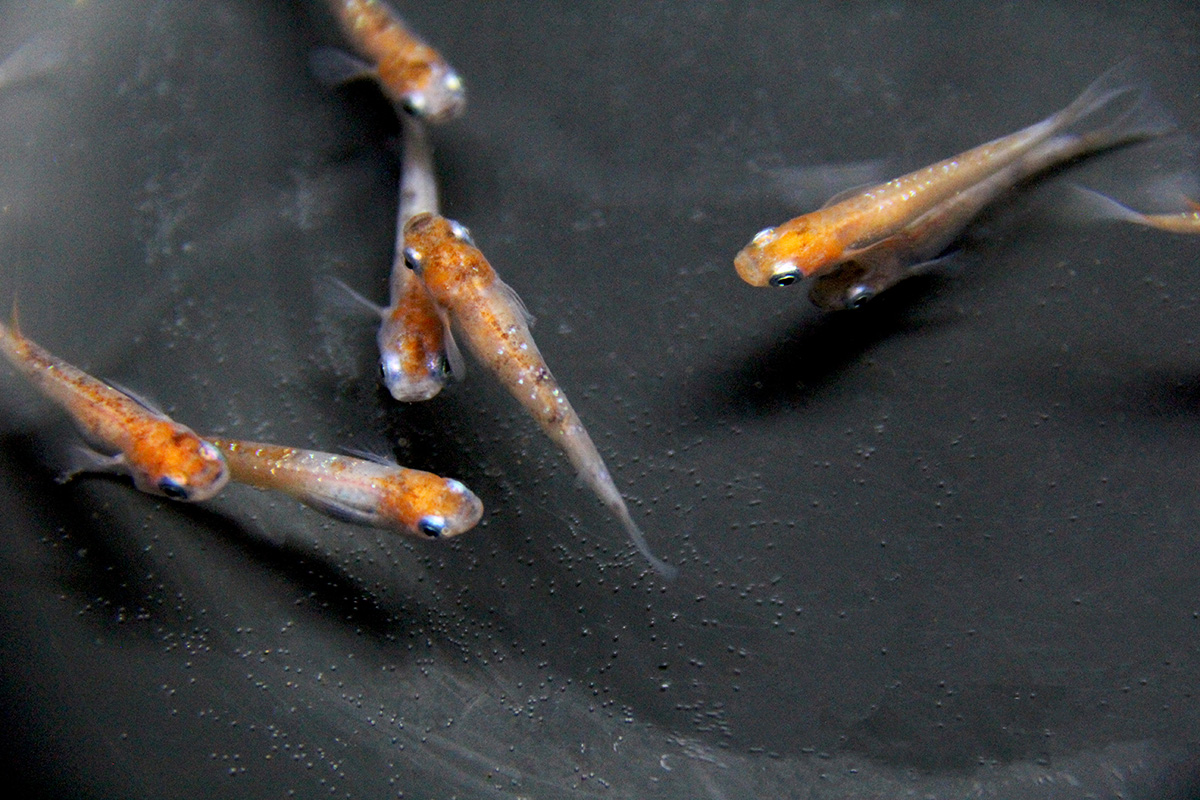 With its distinct tri-color pattern of red/orange, black, and white, these medaka will add a splash of brilliance to any aquarium. For this particular strain of ricefish, it is important they get adequate lighting and are preferably kept in a black container for best coloration. Young fry may take a while to develop their full colors (especially the black markings), which display best when they are kept in a black container or an aquarium with a dark background and bottom. Medaka ricefish originated in East Asia and were commonly found in rice fields, giving them the name "ricefish". They are a very hardy fish that can withstand temperatures as low as 35F and as high as 105F, but prefer to stay between 60F-80F. They do not like aquariums or ponds with a strong current, and are actually often kept in mini ponds with no filter or aeration. Ricefish are like Koi fish, and are bred to be viewed from the top, making them excellent choices for pond fish!